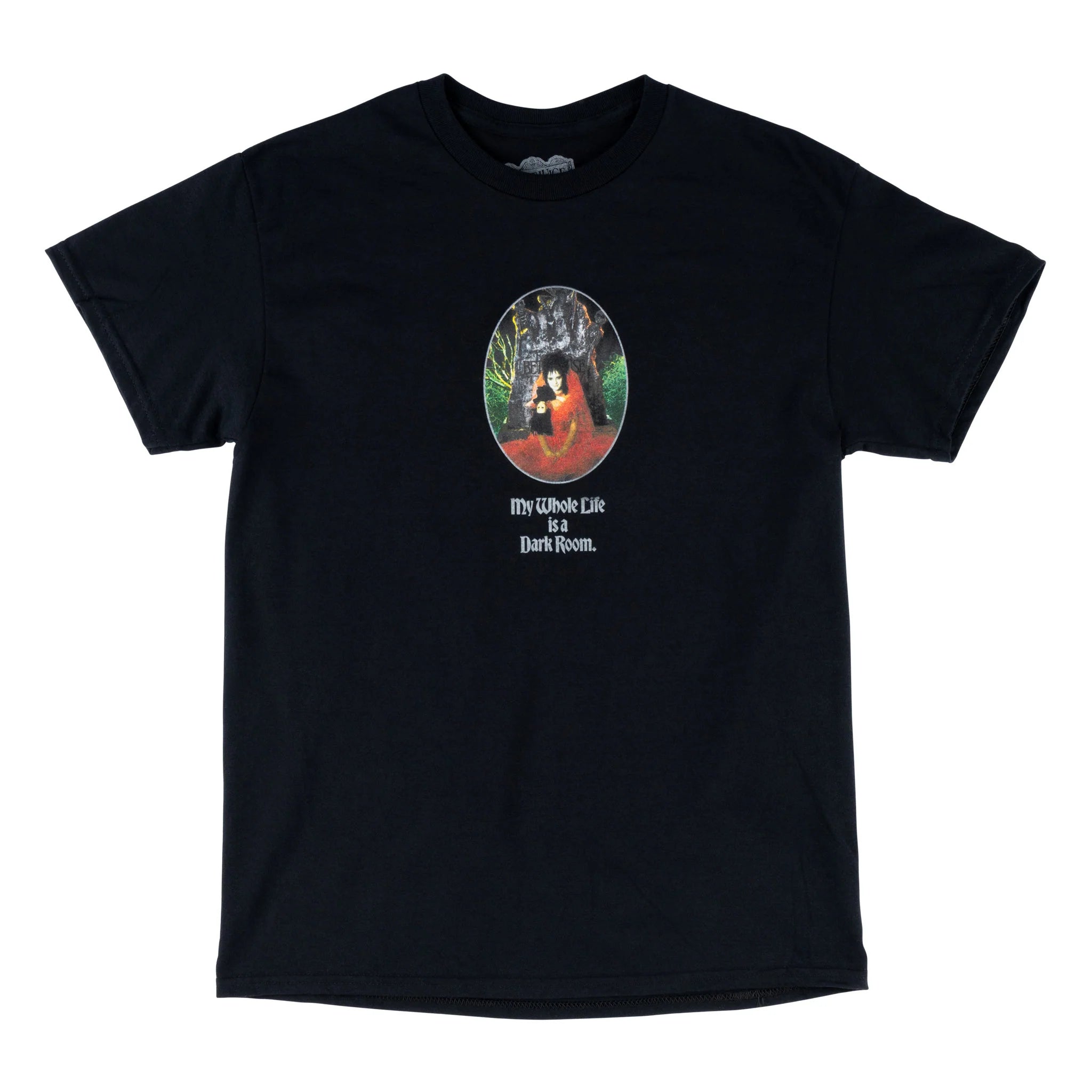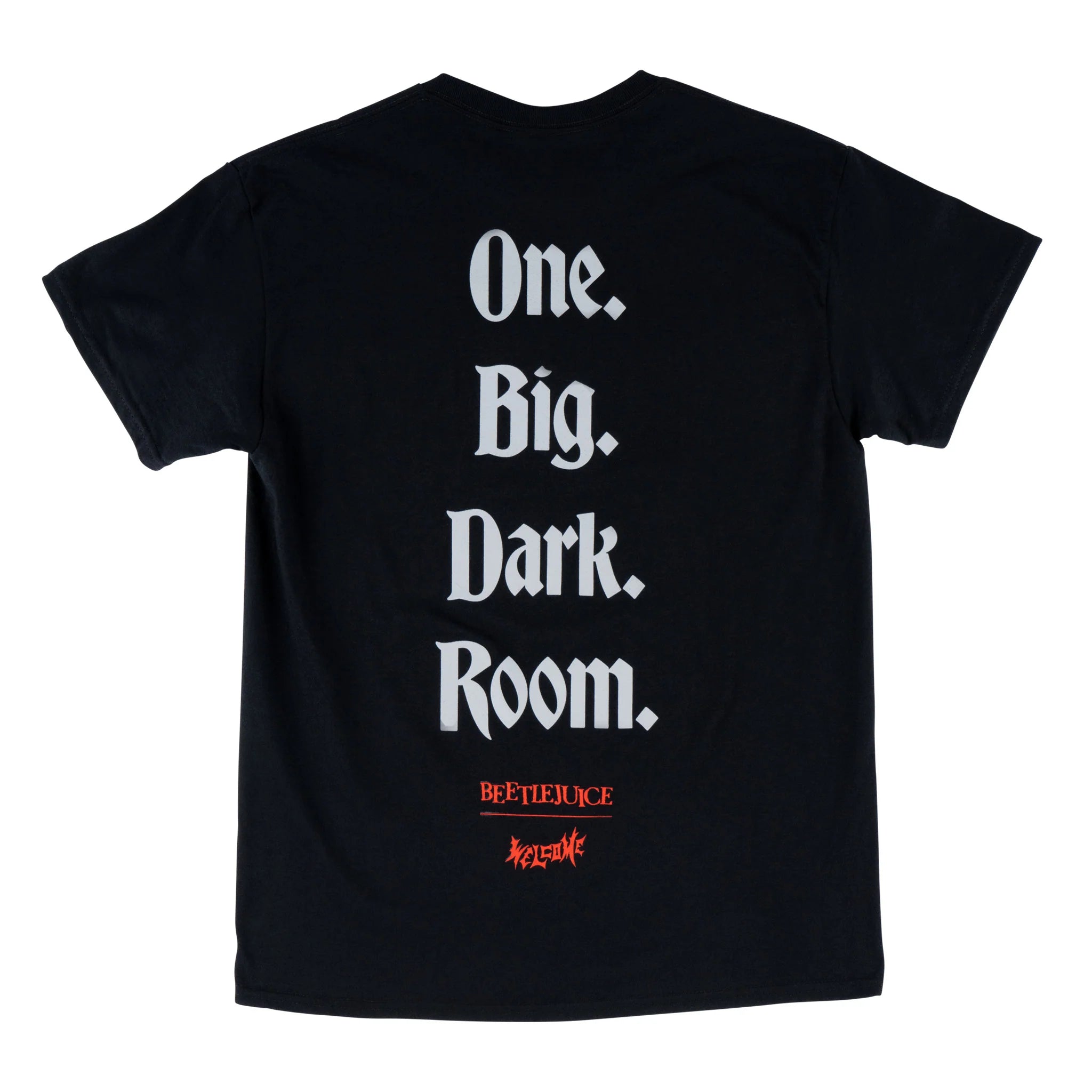 Add an edgy undertone to your outfit with the Welcome and Beetlejuice Dark Room t-shirt with screen-printed graphics. The front of the tee depicts the iconic character Lydia sitting next to Beetlejuice's tombstone above text reading, "My whole life is a dark room." The back displays similar verbage with collaborative red branding below. This comfy cotton tee comes finished with a ribbed neck collar and a printed neck label.