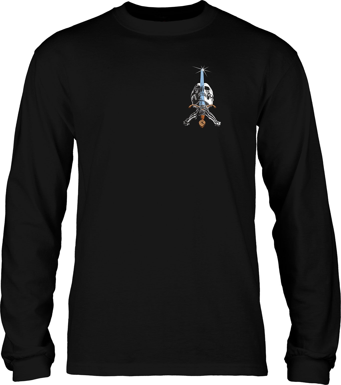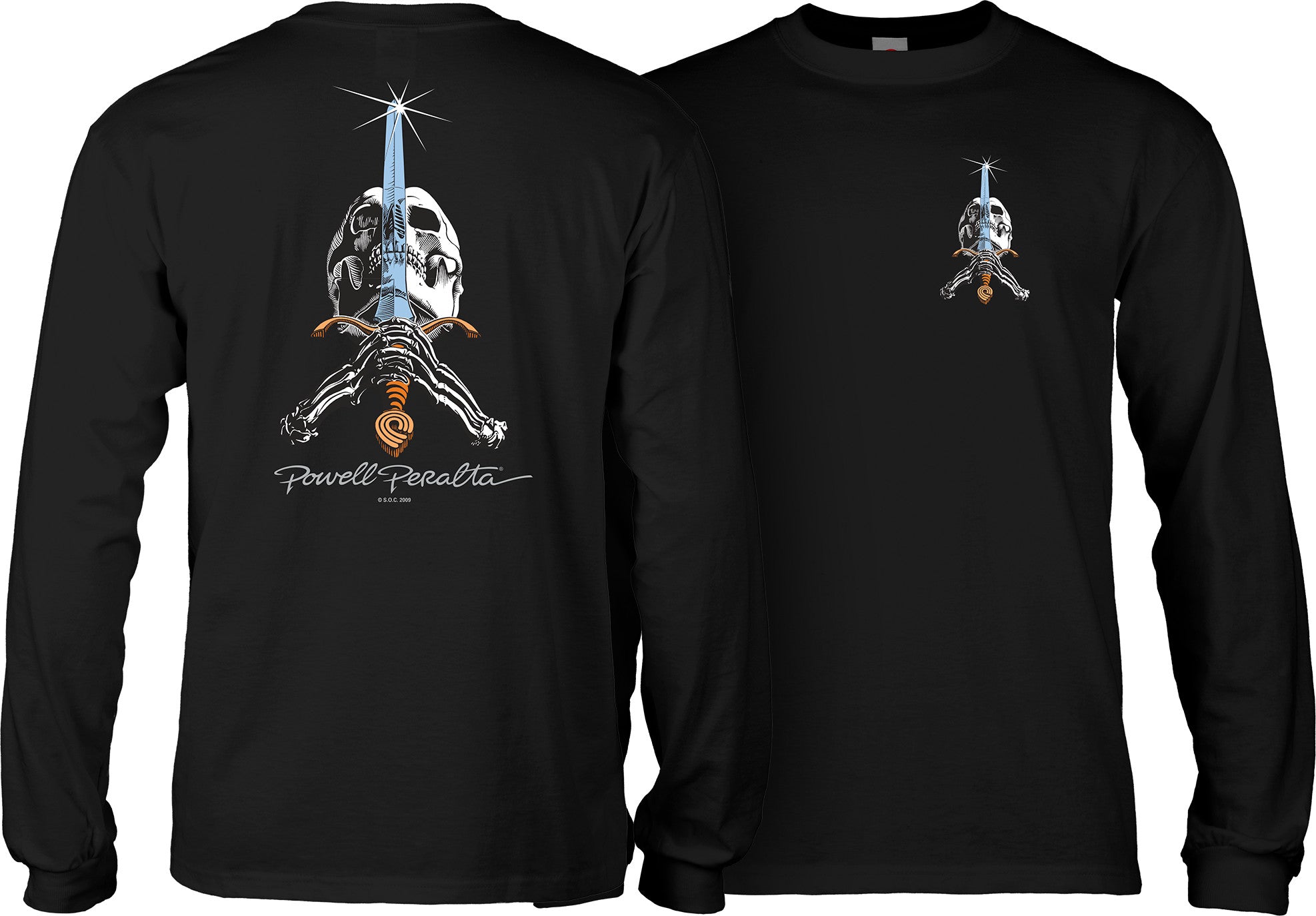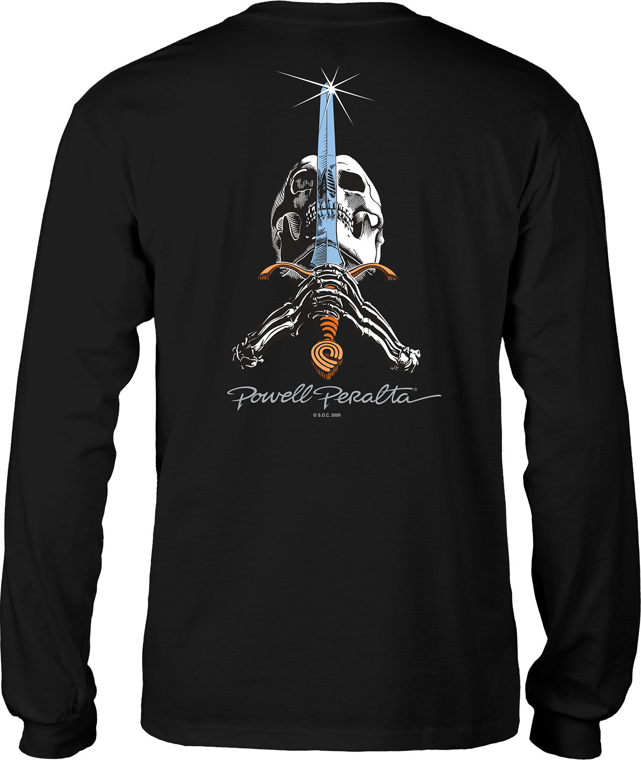 The Rodriguez "Skull & Sword" deck was the first pro signature deck graphic produced by Powell-Peralta. The graphic was conceived by Ray and Illustrated by V.C. Johnson with art direction from George Powell in 1979.