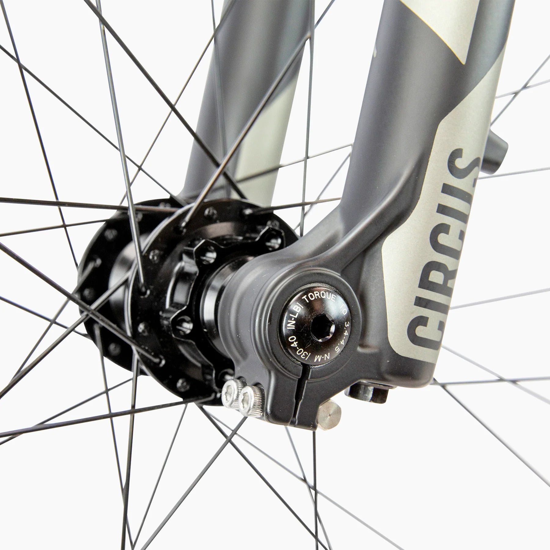- Fork: Manitou Circus Expert Air, 100mm travel, 41mm offset, 1.5 Alloy steer, 20mm axel