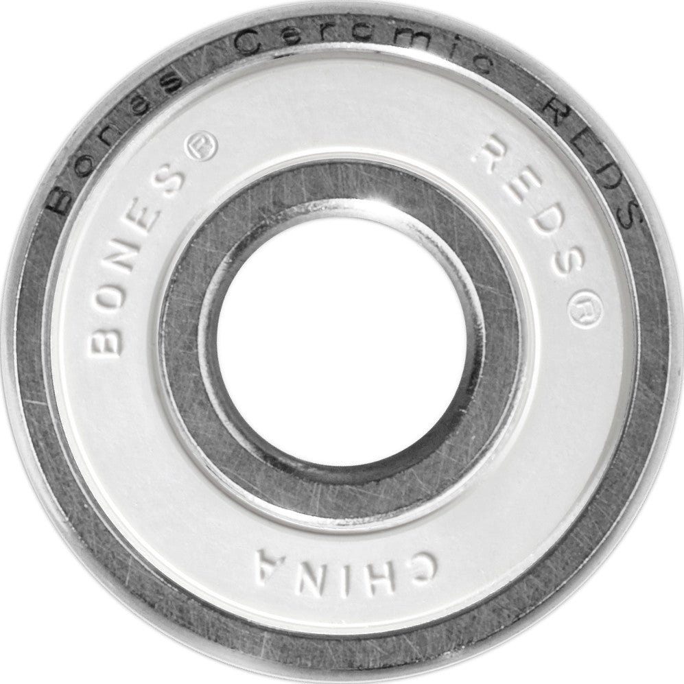 Bones Ceramic Super REDS are lighter and provide faster acceleration because the balls weigh much less. They create less friction and are thus faster than Super REDS, with or without lubricant! When you get dirt into your Ceramic Super REDS, the ceramic balls will help to re-polish the steel races flat again, providing a self-healing benefit because ceramic balls are so much harder than steel. Finally, ceramic balls will not rust, further lengthening their life. Ceramic Super REDS use a bone colored shield with laser-engraved outer races for identification.