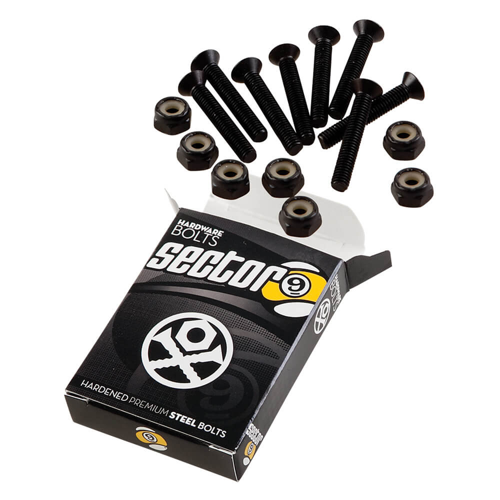 El hardware de patineta Phillips de 1-1/4" de Sector 9 se utiliza para sujetar los ejes de patineta a la plataforma. Un juego simple de tuercas y pernos hechos de acero de primera calidad.