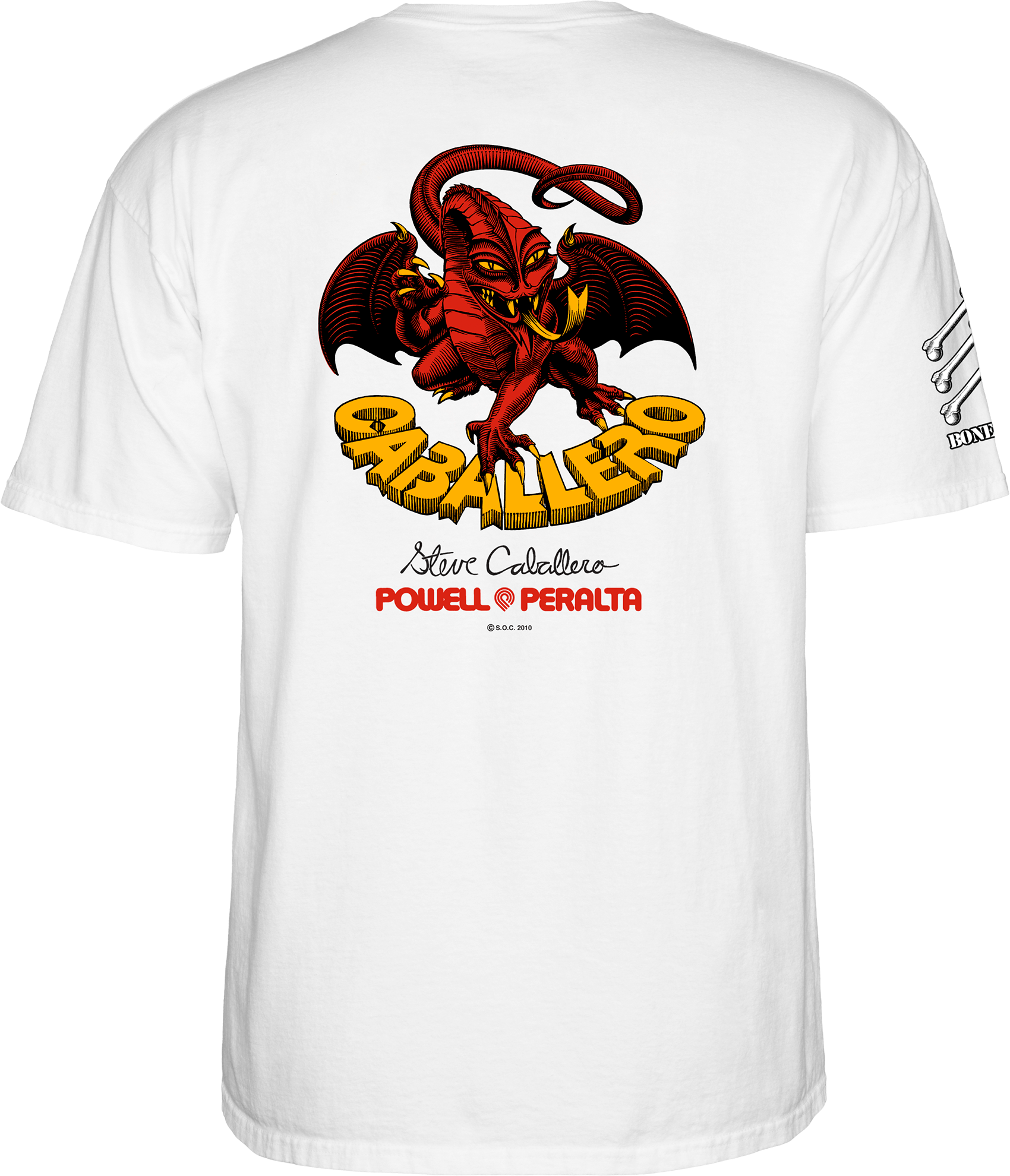 Powel Peralta Bones Brigade "Steve Caballero" Short Sleeve T-Shirt Series 17. Classic Bones Brigade Steve Caballero graphic. Small front logo, Large logo on back.