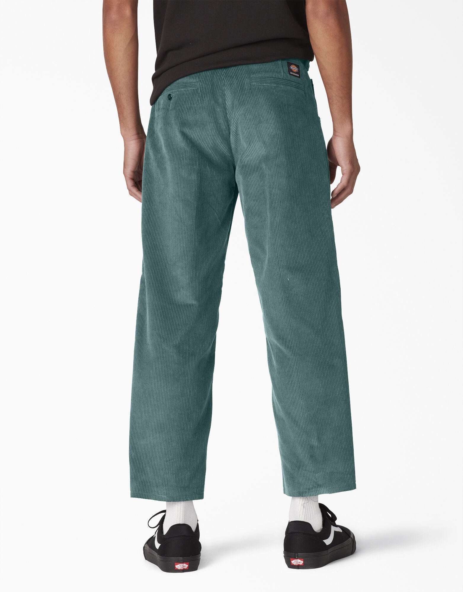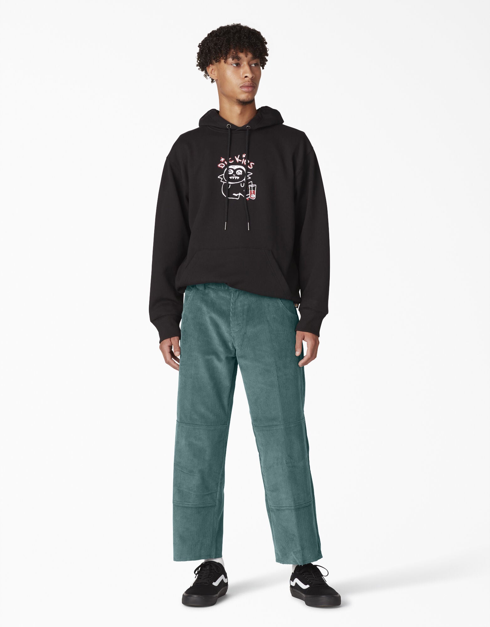 Loose straight fit double knee corduroy pant, cropped with raw edge hem and inside pocket printed with Franky Villani art.