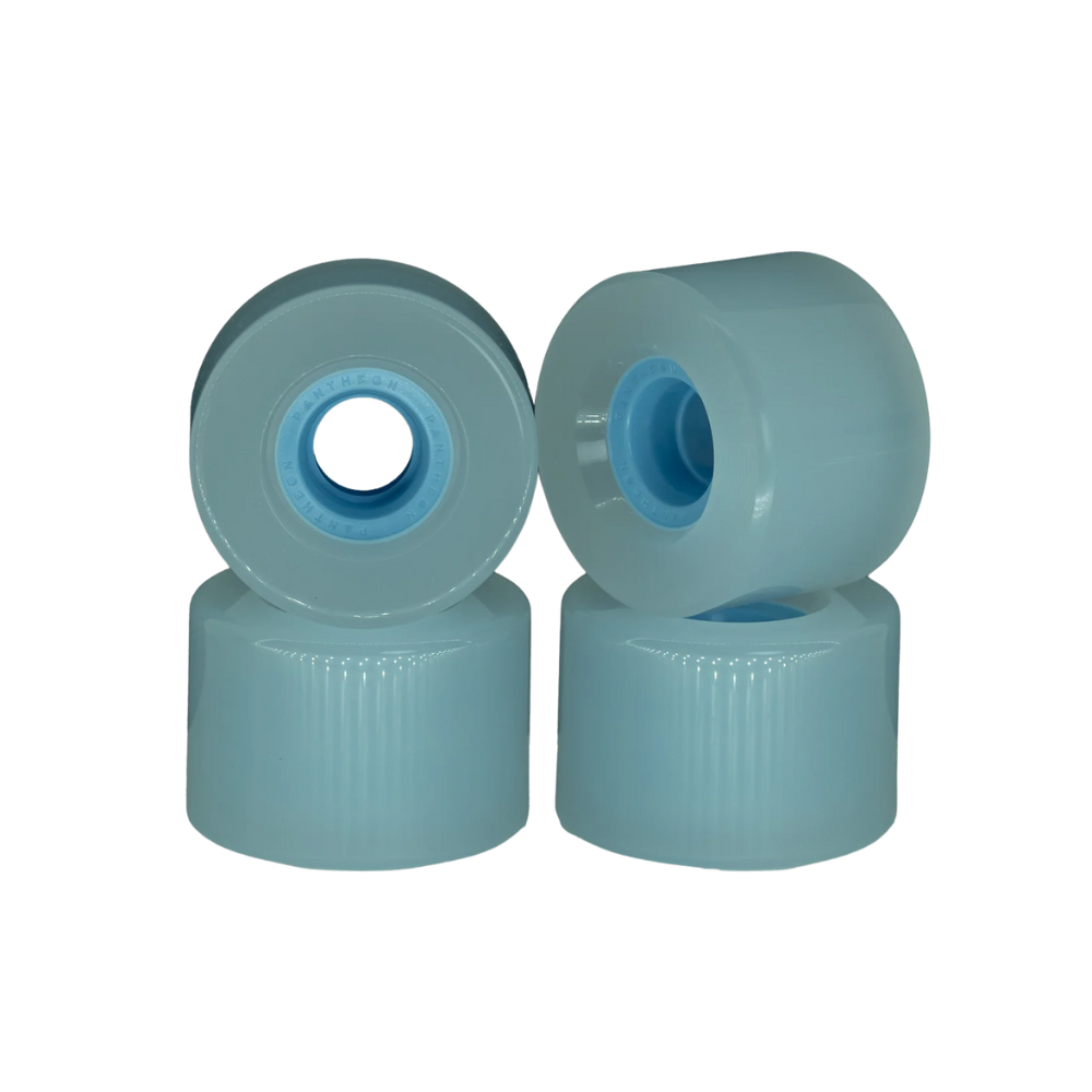 Pantheon Sliders wheels are on the menu! The Sliders are a 66mm slide wheel that prioritize grip and feedback and a high value, long lasting slidey experience. These wheels are an expression of what we think is important in a smaller wheel, solving some of the issues that we find pretty typical of smaller wheels. Usually, wheels in the 65mm range have a bit of a rough ride due to shallow urethane depth as a result of using one of a couple stock freeride cores available at most wheel manufacturing facilities.