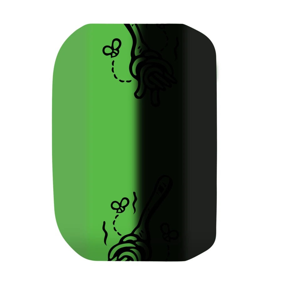Slime Balls Double Take Cafe Vomit Mini with art by Falu @falucarolei. Double takes have are colored urethane on one side with graphic and dyed black on the other side. Wide asymmetrical shape featuring a rounded back and a conical front with a wider riding surface for increased lock-in on grinds and control on all surfaces.